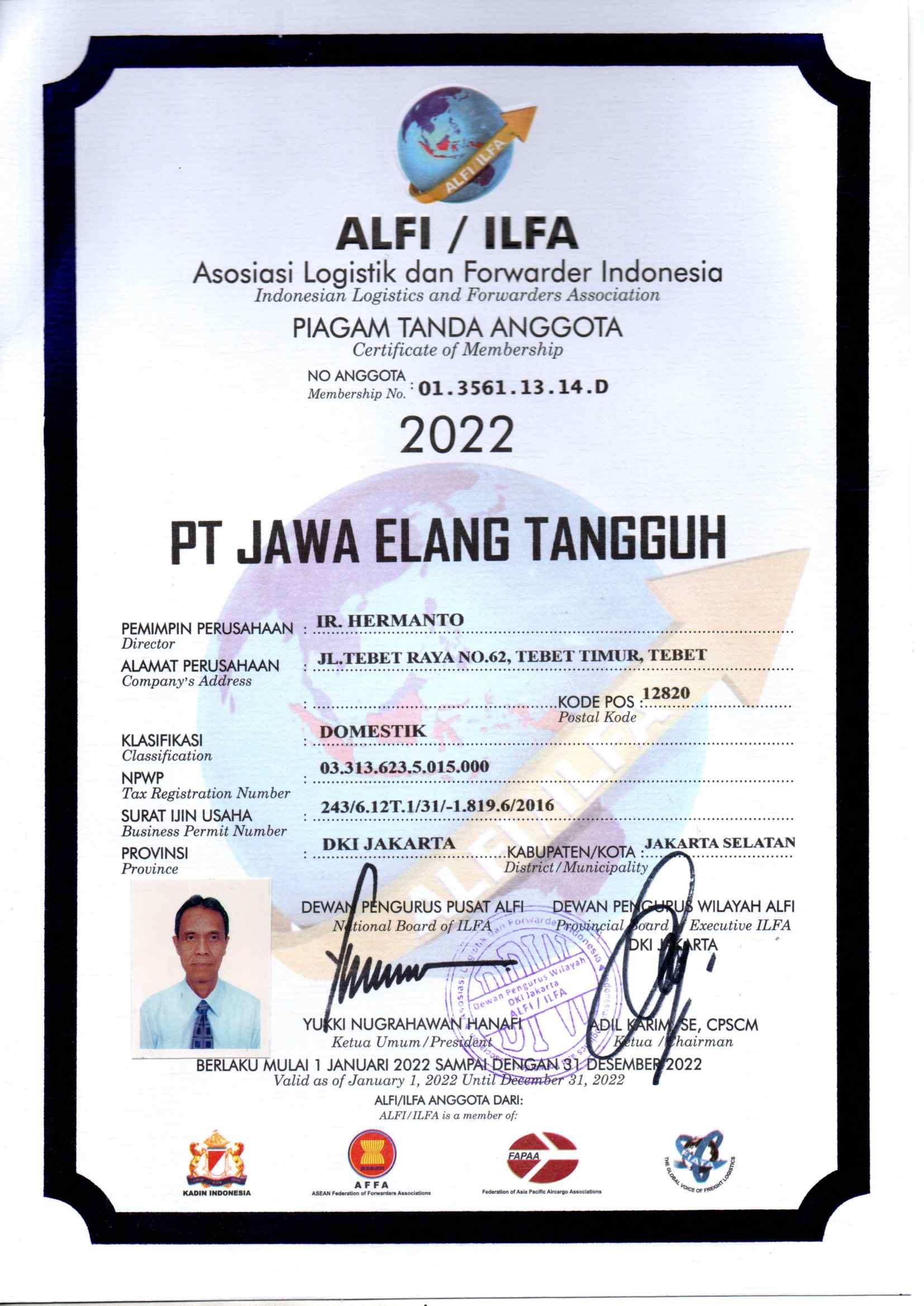 Piagam Tanda Anggota Asosiasi Logistik dan Forwarder Indonesia